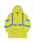 The GloWear 8366 Lightweight Hi-Vis Rain Jacket is designed with waterproof materials (150D polyester oxford with a polyurethane (PU) coating) and fully taped seams for reliable protection in the face of stormy weather. Compliant to ANSI/ISEA 107, Type R Class 3 with reflective tape for enhanced low-light visibility. This lightweight reflective rain jacket easily fits over workwear without sacrificing mobility. Fully taped seams are bonded to the jacket to keep water from sneaking in, while a vented cape-back allows heat and moisture to escape for added breathability. An attached drawstring hood can be stowed away when not needed. Reflective tape on chest and arms adds visibility at night or in low-light conditions. It's the perfect lightweight waterproof work jacket for those working in road construction, utilities, construction, emergency response, airline, railway or survey crews.
