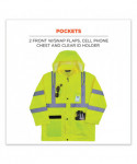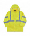This hi-vis rain jacket is designed with waterproof materials (150D polyester oxford with a polyurethane (PU) coating) and fully taped seams for reliable protection in the face of stormy weather. Compliant to ANSI/ISEA 107, Type R Class 3 with reflective tape for enhanced low-light visibility. This lightweight reflective rain jacket easily fits over workwear without sacrificing mobility. Fully taped seams are bonded to the jacket to keep water from sneaking in, while a vented cape-back allows heat and moisture to escape for added breathability. An attached drawstring hood can be stowed away when not needed. Reflective tape on chest and arms adds visibility at night or in low-light conditions. It's the perfect lightweight waterproof work jacket for those working in road construction, utili