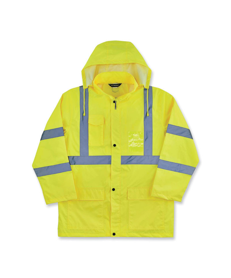 The GloWear 8366 Lightweight Hi-Vis Rain Jacket is designed with waterproof materials (150D polyester oxford with a polyurethane (PU) coating) and fully taped seams for reliable protection in the face of stormy weather. Compliant to ANSI/ISEA 107, Type R Class 3 with reflective tape for enhanced low-light visibility. This lightweight reflective rain jacket easily fits over workwear without sacrificing mobility. Fully taped seams are bonded to the jacket to keep water from sneaking in, while a vented cape-back allows heat and moisture to escape for added breathability. An attached drawstring hood can be stowed away when not needed. Reflective tape on chest and arms adds visibility at night or in low-light conditions. It's the perfect lightweight waterproof work jacket for those working in road construction, utilities, construction, emergency response, airline, railway or survey crews.