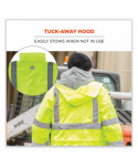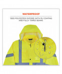 The GloWear 8366 Lightweight Hi-Vis Rain Jacket is designed with waterproof materials (150D polyester oxford with a polyurethane (PU) coating) and fully taped seams for reliable protection in the face of stormy weather. Compliant to ANSI/ISEA 107, Type R Class 3 with reflective tape for enhanced low-light visibility. This lightweight reflective rain jacket easily fits over workwear without sacrificing mobility. Fully taped seams are bonded to the jacket to keep water from sneaking in, while a vented cape-back allows heat and moisture to escape for added breathability. An attached drawstring hood can be stowed away when not needed. Reflective tape on chest and arms adds visibility at night or in low-light conditions. It's the perfect lightweight waterproof work jacket for those working in road construction, utilities, construction, emergency response, airline, railway or survey crews.