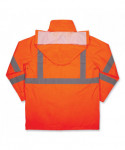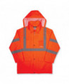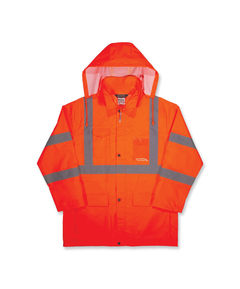 The GloWear 8366 Lightweight Hi-Vis Rain Jacket is designed with waterproof materials (150D polyester oxford with a polyurethane (PU) coating) and fully taped seams for reliable protection in the face of stormy weather. Compliant to ANSI/ISEA 107, Type R Class 3 with reflective tape for enhanced low-light visibility. This lightweight reflective rain jacket easily fits over workwear without sacrificing mobility. Fully taped seams are bonded to the jacket to keep water from sneaking in, while a vented cape-back allows heat and moisture to escape for added breathability. An attached drawstring hood can be stowed away when not needed. Reflective tape on chest and arms adds visibility at night or in low-light conditions. It's the perfect lightweight waterproof work jacket for those working in road construction, utilities, construction, emergency response, airline, railway or survey crews.