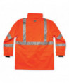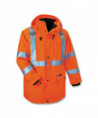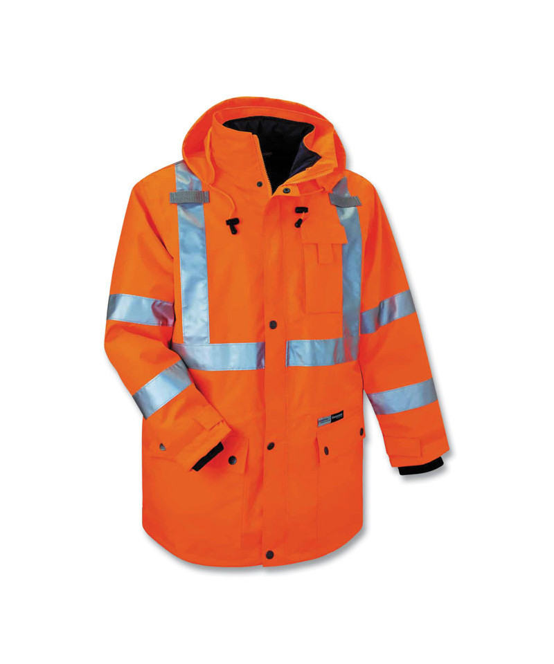 Class 3 4-in-1 jacket for Fall, Winter and Spring. The only jacket you'll need all year. Weatherproof 300D oxford polyester outer shell with breathable PU coating that resists water and wind, for dry comfort all day. Inner jacket with 100 g 3M Thinsulate lining. Inner jacket zips out and sleeves zip off to create Class 2 thermal vest. Features 2 ANSI-compliant reflective stripes for nighttime visibility. Other features include inset hood with drawstring and stoppers, two external front pockets with snap flaps, cell phone chest poacket and dual mic tabs for clipping radios.