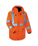Class 3 4-in-1 jacket for Fall, Winter and Spring. The only jacket you'll need all year. Weatherproof 300D oxford polyester outer shell with breathable PU coating that resists water and wind, for dry comfort all day. Inner jacket with 100 g 3M Thinsulate lining. Inner jacket zips out and sleeves zip off to create Class 2 thermal vest. Features 2 ANSI-compliant reflective stripes for nighttime visibility. Other features include inset hood with drawstring and stoppers, two external front pockets with snap flaps, cell phone chest poacket and dual mic tabs for clipping radios.