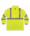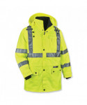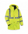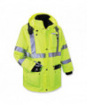 Class 3 4-in-1 jacket for Fall, Winter and Spring. The only jacket you'll need all year. Weatherproof 300D oxford polyester outer shell with breathable PU coating that resists water and wind, for dry comfort all day. Inner jacket with 100 g 3M Thinsulate lining. Inner jacket zips out and sleeves zip off to create Class 2 thermal vest. Features 2 ANSI-compliant reflective stripes for nighttime visibility. Other features include inset hood with drawstring and stoppers, two external front pockets with snap flaps, cell phone chest poacket and dual mic tabs for clipping radios.