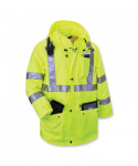 Class 3 4-in-1 jacket for Fall, Winter and Spring. The only jacket you'll need all year. Weatherproof 300D oxford polyester outer shell with breathable PU coating that resists water and wind, for dry comfort all day. Inner jacket with 100 g 3M Thinsulate lining. Inner jacket zips out and sleeves zip off to create Class 2 thermal vest. Features 2 ANSI-compliant reflective stripes for nighttime visibility. Other features include inset hood with drawstring and stoppers, two external front pockets with snap flaps, cell phone chest poacket and dual mic tabs for clipping radios.