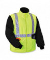 Class 3 4-in-1 jacket for Fall, Winter and Spring. The only jacket you'll need all year. Weatherproof 300D oxford polyester outer shell with breathable PU coating that resists water and wind, for dry comfort all day. Inner jacket with 100 g 3M Thinsulate lining. Inner jacket zips out and sleeves zip off to create Class 2 thermal vest. Features 2 ANSI-compliant reflective stripes for nighttime visibility. Other features include inset hood with drawstring and stoppers, two external front pockets with snap flaps, cell phone chest poacket and dual mic tabs for clipping radios.