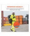 Hi-vis rain pants offer waterproof, breathable protection against wet conditions. A comfortable elastic waistband means these waterproof work pants can be worn alone or over a base layer. The pant legs have zip openings to easily fit over boots. These work rain pants are built for demanding conditions with durable 300D poly oxford material and a breathable polyurethane (PU) coating that lets moisture escape while sealing out the rain to keep workers cool and comfortable. The ANSI compliant high visibility polyester fabric and 3M Scotchlite 2 reflective tape keeps workers highly visible at night or in low light conditions. These hi-vis waterproof pants meet ANSI Supplemental Class E Standards. Made for the industrial workplace and workers in low-light environments, flagging crews, utility