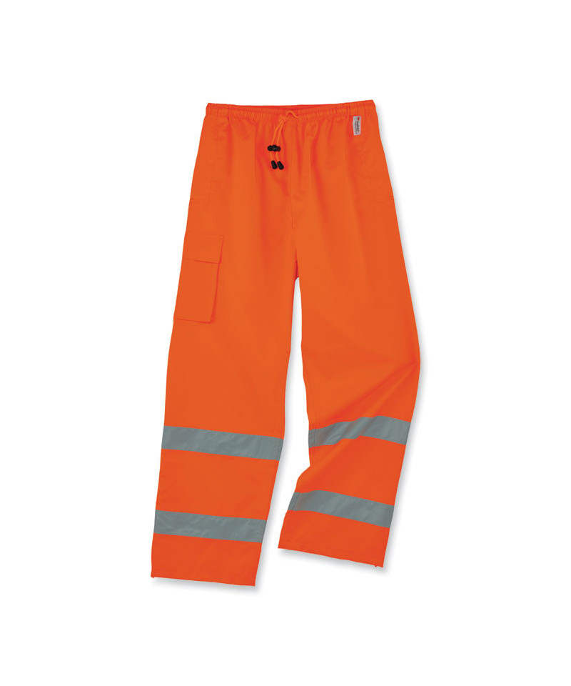 The GloWear 8915 Hi-Vis Rain Pants offer waterproof, breathable protection against wet conditions. A comfortable elastic waistband means these waterproof work pants can be worn alone or over a base layer. The pant legs have zip openings to easily fit over boots. These work rain pants are built for demanding conditions with durable 300D poly oxford material and a breathable polyurethane (PU) coating that lets moisture escape while sealing out the rain to keep workers cool and comfortable. The ANSI compliant high visibility polyester fabric and 3M Scotchlite 2 reflective tape keeps workers highly visible at night or in low light conditions. These hi-vis waterproof pants meet ANSI Supplemental Class E Standards. Made for the industrial workplace and workers in low-light environments, flagging crews, utility crews, road construction, railway workers and any others working in the rain.