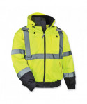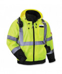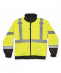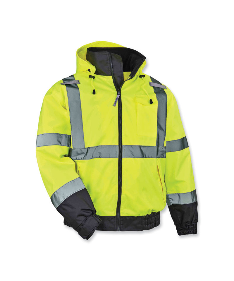GloWear 8379 Type R Class 3 Fleece-Lined High Visibility Bomber Jacket has a zip-out fleece liner and can be worn three different ways for the ultimate in adaptability for winter workwear. This fleece-lined hi-vis jacket is a Type R Class 3 winter work jacket with 2" ANSI-compliant reflective material for compliance, visibility and warmth at an economical price. This high visibility winter jacket can be worn three different ways: 1) as a jacket with the fleece liner zipped in, 2) fleece liner on its own, or 3) wear the shell on its own for a lightweight, water-resistant outer layer. The weatherproof 300D oxford outer shell with a PU coating resists water and wind to keep you dry and warm. Cuffs feature hook-and-loop straps to seal out the cold. Featuring two external front pockets. There are two mic tabs located on the upper chest of the jacket.