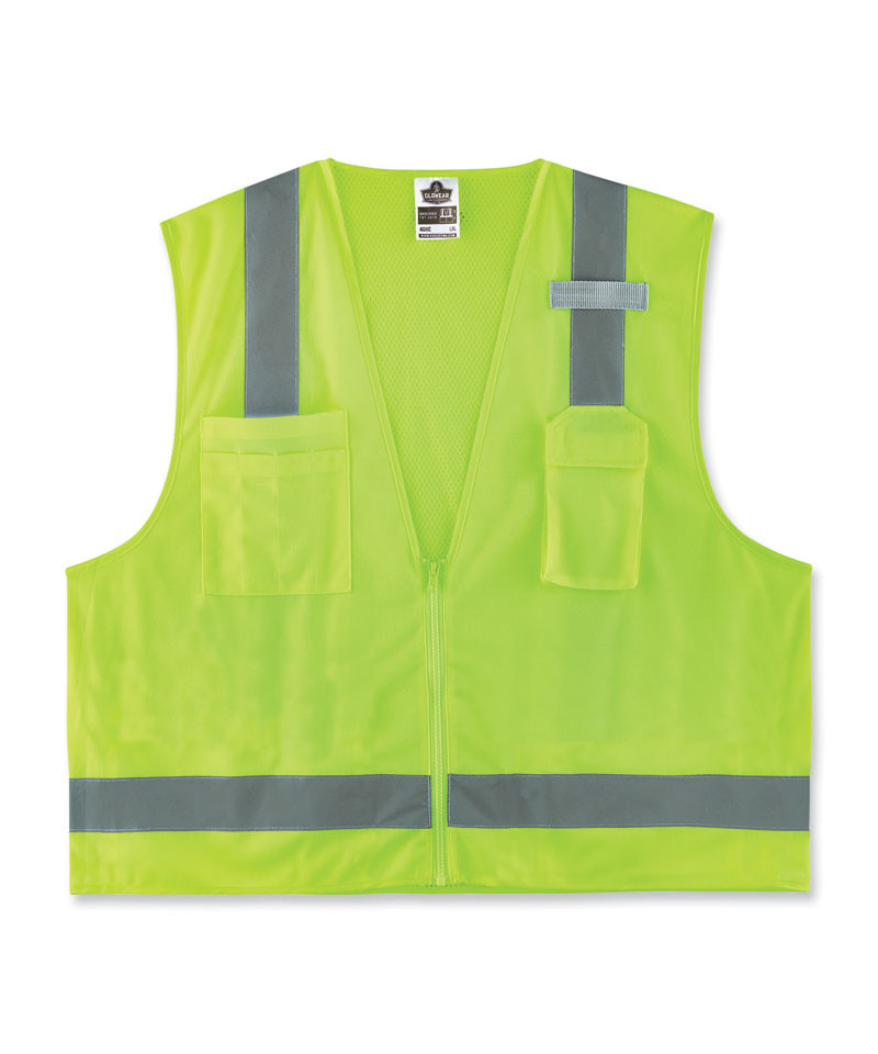 The GloWear 8249Z-S Hi-Vis Surveyors Vest is an ANSI 107 Type R, Class 2 vest with a 3.6 oz polyester solid front and breathable 3.3 oz polyester mesh back. This hi-vis vest features 2" reflective tape for enhanced low-light visibility. With two interior and two exterior pockets, including a cell phone chest pocket, this vest provides ample storage for pens, notebooks, tablets and more. A single mic tab allows convenient radio access, and a zipper closure makes for easy on and off. This vest is available in single sizes to allow workers to order their exact size for a more tailored, performance-style fit compared to dual-size vests (tip: for best fit, select one size down from your normal T-shirt size). This reflective safety vest is ideal for anyone requiring Type R, Class 2 apparel.