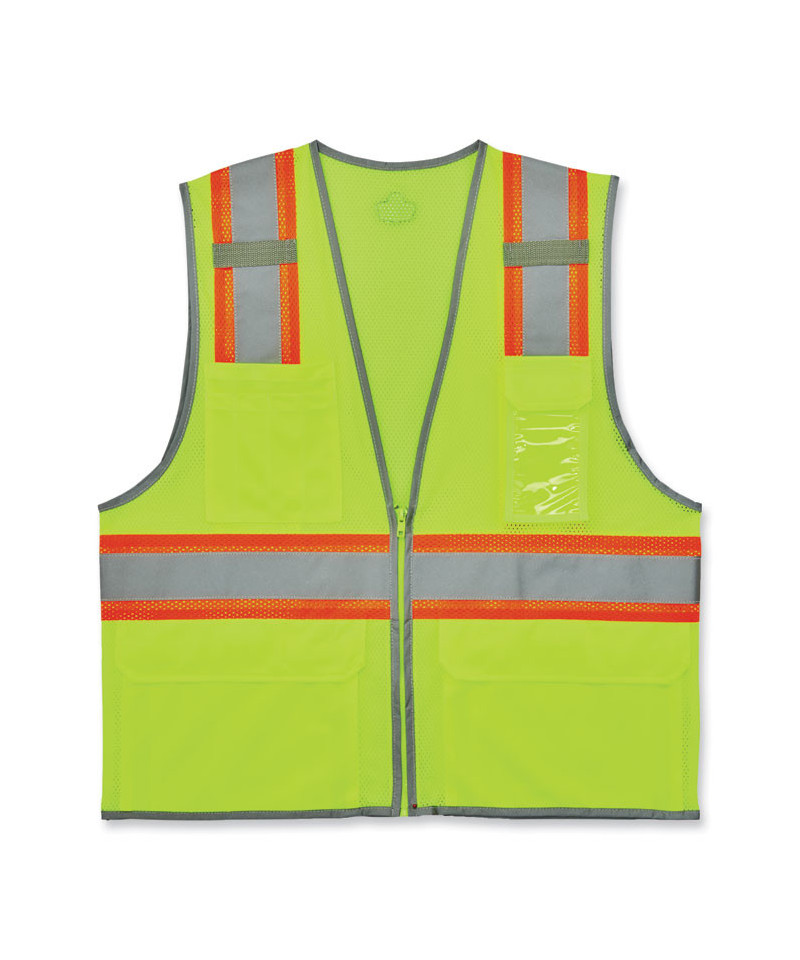 The GloWear 8246Z-S Mesh Two-Tone Hi-Vis Safety Vest is an ANSI 107 Type R, Class 2 vest made of 3.3oz polyester mesh. This hi-vis vest features 2" reflective tape set on a 3.5" contrasting mesh background and reflective piping for enhanced low-light visibility. Built for storage, this vest has two inside and four outside pockets, a clear ID badge holder and dual radio mic tabs. A zipper closure makes for easy on and off. This vest is available in single sizes to allow workers to order their exact size for a more tailored, performance-style fit compared to dual-size vests (tip: for best single-size fit, select one size down from your normal T-shirt size). This reflective safety vest is ideal for anyone requiring Type R, Class 2 apparel, including road construction, baggage handling and municipalities.