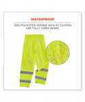 Lightweight hi-vis rain pants offer protection against wet conditions while ensuring safety. A comfortable elastic waistband means these waterproof work pants can be worn alone or over a base layer, while the pant legs have snap cuffs to easily fit over boots and tightened to keep the wind out. These work rain pants are built for demanding conditions with rugged yet lightweight waterproof materials (150D polyester oxford material with a PU coating) and fully taped seams. The ANSI/ISEA 107 compliant high visibility polyester fabric and 2 reflective tape keeps workers highly visible at night or in low light conditions. These hi-vis waterproof pants meet ANSI 107 Supplemental Class E Standards. Made for the industrial workplace and workers in low-light environments, flagging crews, utility c