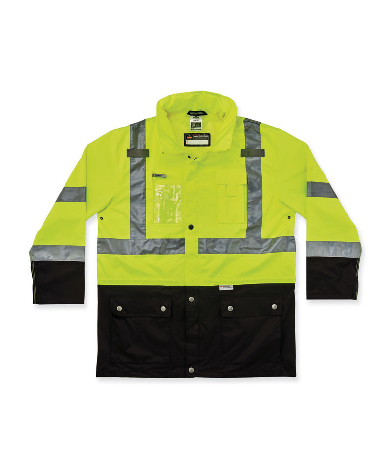 Class 3 outer shell jacket made of breathable poly keeps the rain out while letting perspiration escape. Black panels hide dirt in high wear areas. Fits over 8287 inner jacket to create a thermal 4-in-1 jacket. 2 ANSI-compliant 3M Scotchlite Reflective for visibility. Inset hood with drawstring and stoppers. A total of four pockets and a clear ID holder to keep personal items secure. Dual mic tabs for clipping radios.