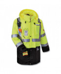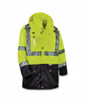 Class 3 outer shell jacket made of breathable poly keeps the rain out while letting perspiration escape. Black panels hide dirt in high wear areas. Fits over 8287 inner jacket to create a thermal 4-in-1 jacket. 2 ANSI-compliant 3M Scotchlite Reflective for visibility. Inset hood with drawstring and stoppers. A total of four pockets and a clear ID holder to keep personal items secure. Dual mic tabs for clipping radios.