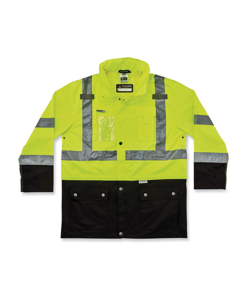 Class 3 outer shell jacket made of breathable poly keeps the rain out while letting perspiration escape. Black panels hide dirt in high wear areas. Fits over 8287 inner jacket to create a thermal 4-in-1 jacket. 2 ANSI-compliant 3M Scotchlite Reflective for visibility. Inset hood with drawstring and stoppers. A total of four pockets and a clear ID holder to keep personal items secure. Dual mic tabs for clipping radios.