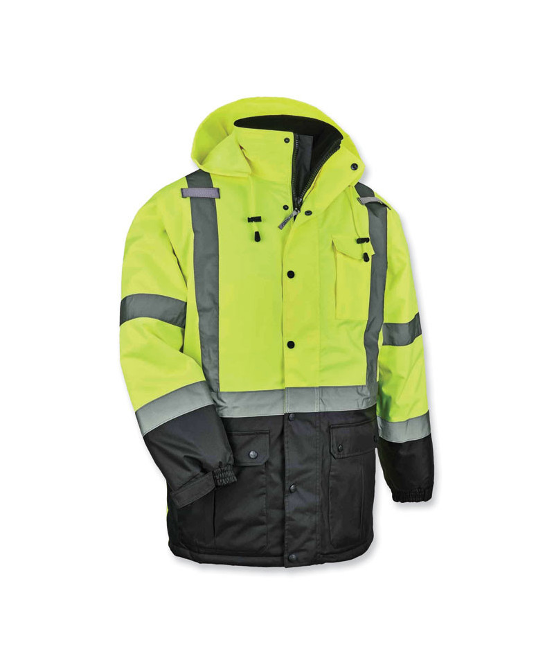 The GloWear 8384 Type R Class 3 Thermal Quilted High Visibility Jacket is the ideal warm winter work jacket for safety on the job. This Type R high visibility jacket has an insulated interior with fleece for warmth in frigid conditions. This winter workwear features 160 g thermal insulation plus fleece, which traps body heat to keep you warmer in the cold. The 300D oxford polyester outer shell with PU coating resists water and wind, for dry comfort all day. The black panels hide dirt and wear. Cuffs feature hook and loop straps to seal out the cold. Features external front pockets with snap flaps, combination cell phone chest pocket, dual-slot pen pocket on arm, and dual-mic tabs for clipping radios. This safety high-visibility jacket is rated Type R Class 3 for increased visibility and features 2 ANSI-compliant reflective stripes for nighttime visibility.