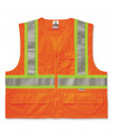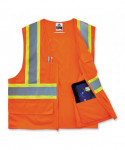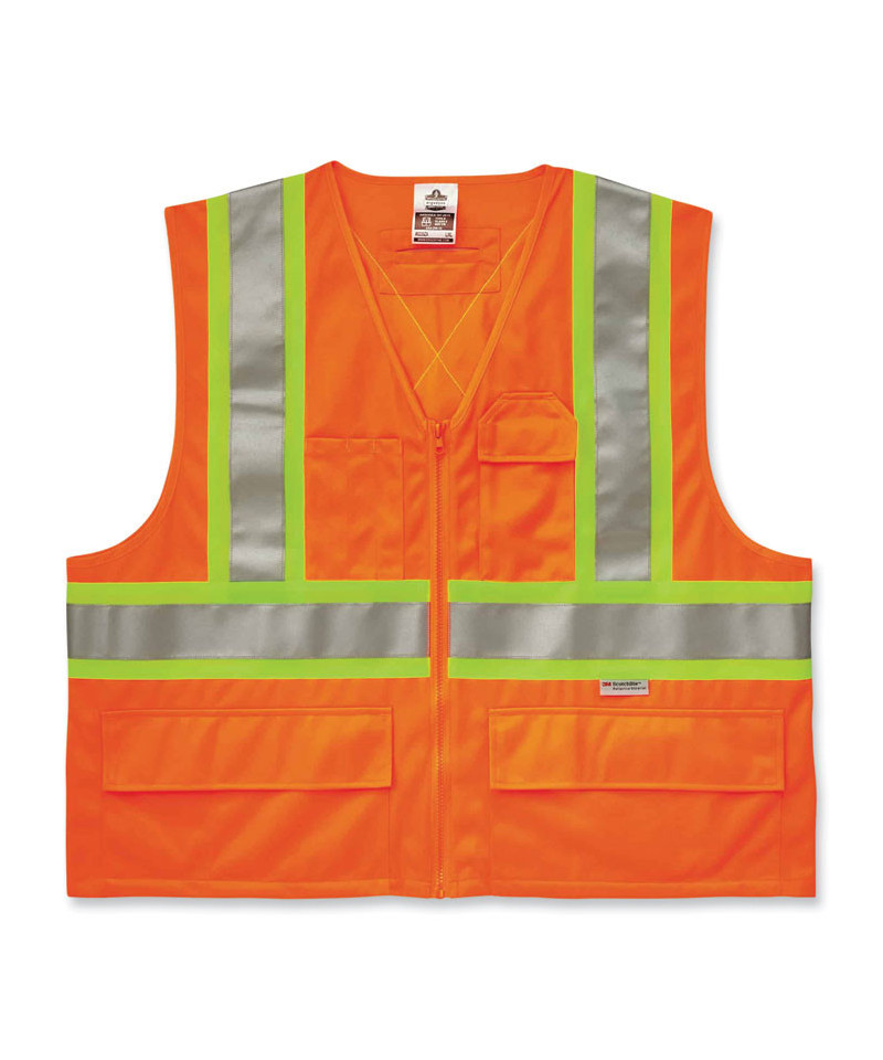 Class 2 Two-Tone X-Back Vest has a CSA compliant design with D-ring access and multiple pockets. Made of lightweight 3.6 oz polyester. Features 2" ANSI-compliant 3M Scotchlite Reflective accents on a 3.5" contrasting background. One inside and four outside pockets for storage.