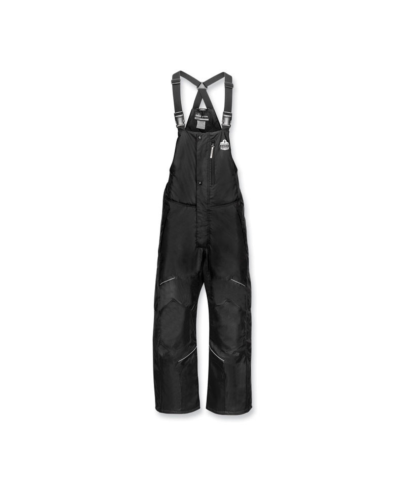 The N-Ferno 6472 Insulated Bib Overalls are designed to be worn over work pants for warmth and durability in cold environments. The 300D polyester oxford with breathable water-repellent coating protects from the elements, while the thermal insulation and quilted lining keeps workers comfortably warm. These black winter work bibs hide dirt and feature reinforced knee patches for long-lasting wear. A heavy-duty front zipper closure, comfortable elastic-stretch sides and full-length zippered pant legs make for easy on/off without removing boots. Adjustable non-slip elastic straps allow workers to get the perfect fit. For convenient storage, these work bibs have one chest pocket and two side pockets. Reflective accents keep workers safe and seen. These insulated bib overalls are ideal for those who work in cold environments where hi-vis is not required, including refrigeration, transportation, airlines or agriculture.