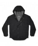 Heavy-duck canvas work jacket is a rugged midweight jacket for warmth in cool conditions. The cotton duck canvas features a wind- and water-resistant DWR finish for long-lasting durability and dry all-day wear. The body and hood are lined with warm and comfortable sherpa, while the flexible gusseted sleeves feature 40 gm quilted insulation for warmth without compromised mobility. For a snug and custom fit that keeps cold air out, this canvas work jacket features rib knit cuffs, an elastic bungee waist, drawstring hood and a long tail that won't ride up. Built for the job, the hood is large enough to be pulled up over hard hats. A zippered closure with snap buttons makes for easy on and off. This sherpa-lined canvas jacket features six pockets for convenient storage.