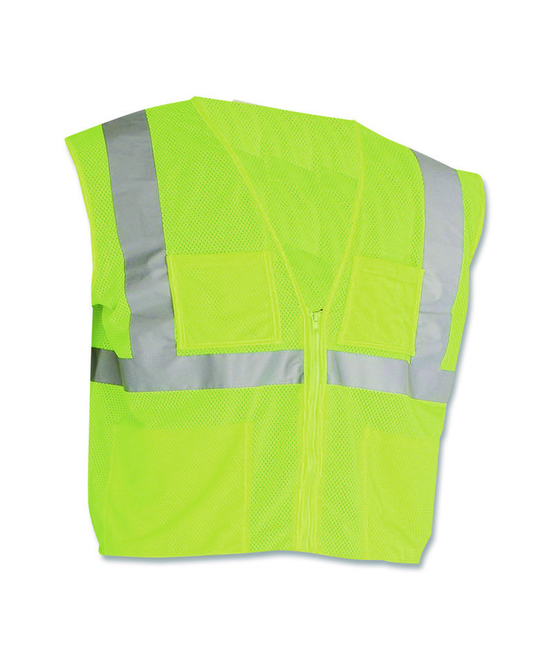 For workers exposed to traffic traveling over 25 mph and who work against complex backgrounds. Zipper enclosure for secure closure of vest. Features high-vis color and reflective 2" silver stripes that make you easy to see both night and day, so it's ideal for a range of tasks where visibility is important. With a 100 percent polyester mesh fabric design and zipper closure, this vest is lightweight and easy to wear over clothing. Includes two lower internal pockets, two upper chest external pockets one including four pen pockets.