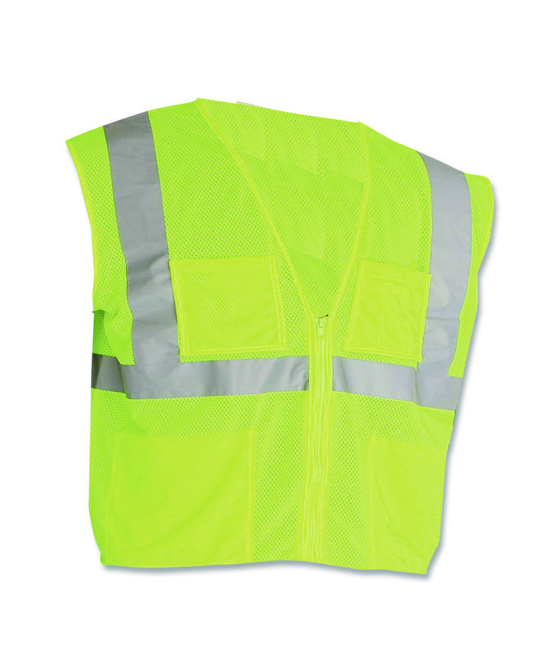 For workers exposed to traffic traveling over 25 mph and who work against complex backgrounds. Zipper enclosure for secure closure of vest. Features high-vis color and reflective 2" silver stripes that make you easy to see both night and day, so it's ideal for a range of tasks where visibility is important. With a 100 percent polyester mesh fabric design and zipper closure, this vest is lightweight and easy to wear over clothing. Includes two lower internal pockets, two upper chest external pockets one including four pen pockets.