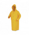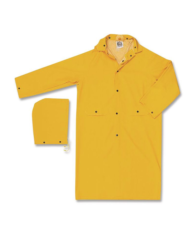 River City® 200C Classic Rain Coat offers cape ventilated back with three mesh holes and two patch pockets. 49" length as well as 0.35 mm of thickness. Black plastic snap storm fly front. Features underarm vents for improved air flow. Black plastic take up snaps at the wrists. Made of durable PVC/polyester. Includes detachable hood with drawstring.