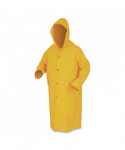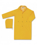River City® 200C Classic Rain Coat offers cape ventilated back with three mesh holes and two patch pockets. 49" length as well as 0.35 mm of thickness. Black plastic snap storm fly front. Features underarm vents for improved air flow. Black plastic take up snaps at the wrists. Made of durable PVC/polyester. Includes detachable hood with drawstring.