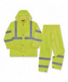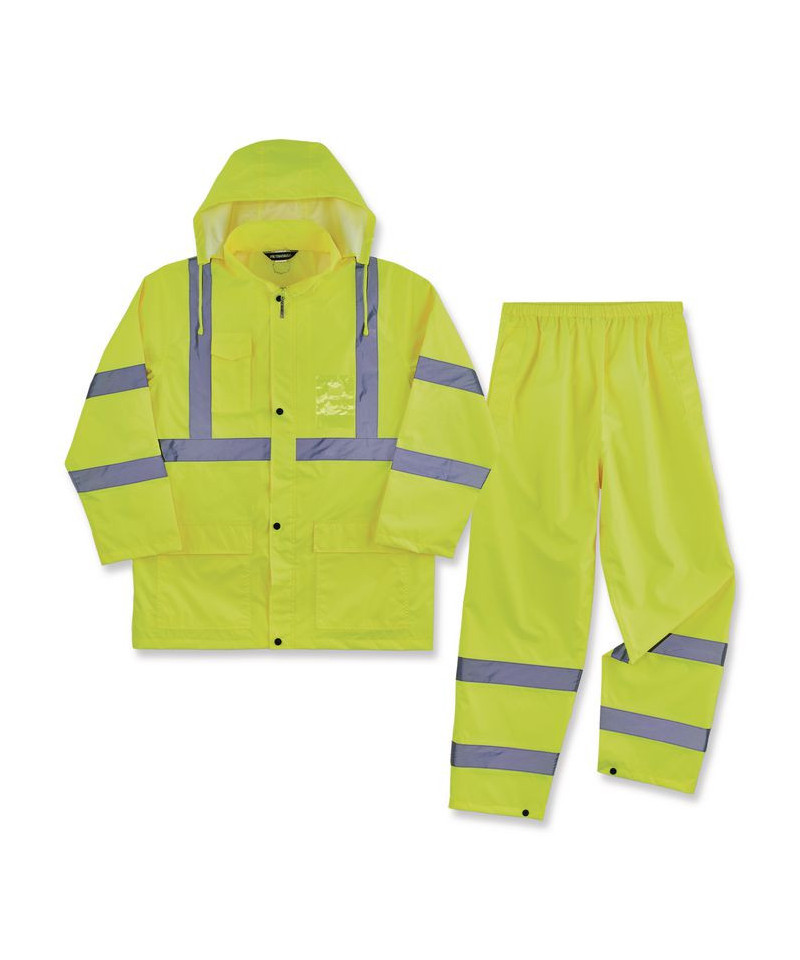 The GloWear 8376K Lightweight Hi-Vis Rain Suit Kit includes the 8366 Rain Jacket and 8916 Rain Pants for protection in wet conditions while maintaining high visibility compliance. The fully waterproof jacket and pants are constructed of rugged 150D polyester oxford with a PU coating and fully taped seams to keep workers dry. Compliant to ANSI/ISEA 107 Type R, Class 3 with reflective tape for enhanced low-light visibility. This lightweight reflective rain suit easily fits over workwear without sacrificing mobility, with an elastic waistband for comfort and snap cuffs on the pants for easy on/off over boots. Fully taped seams are bonded to keep water from sneaking in, while a vented cape-back on the jacket allows heat and moisture to escape for added breathability. An attached drawstring hood can be stowed away when not needed. The ANSI/ISEA 107-compliant high visibility polyester fabric and 2" reflective tape keeps workers highly visible at night or in low light conditions.