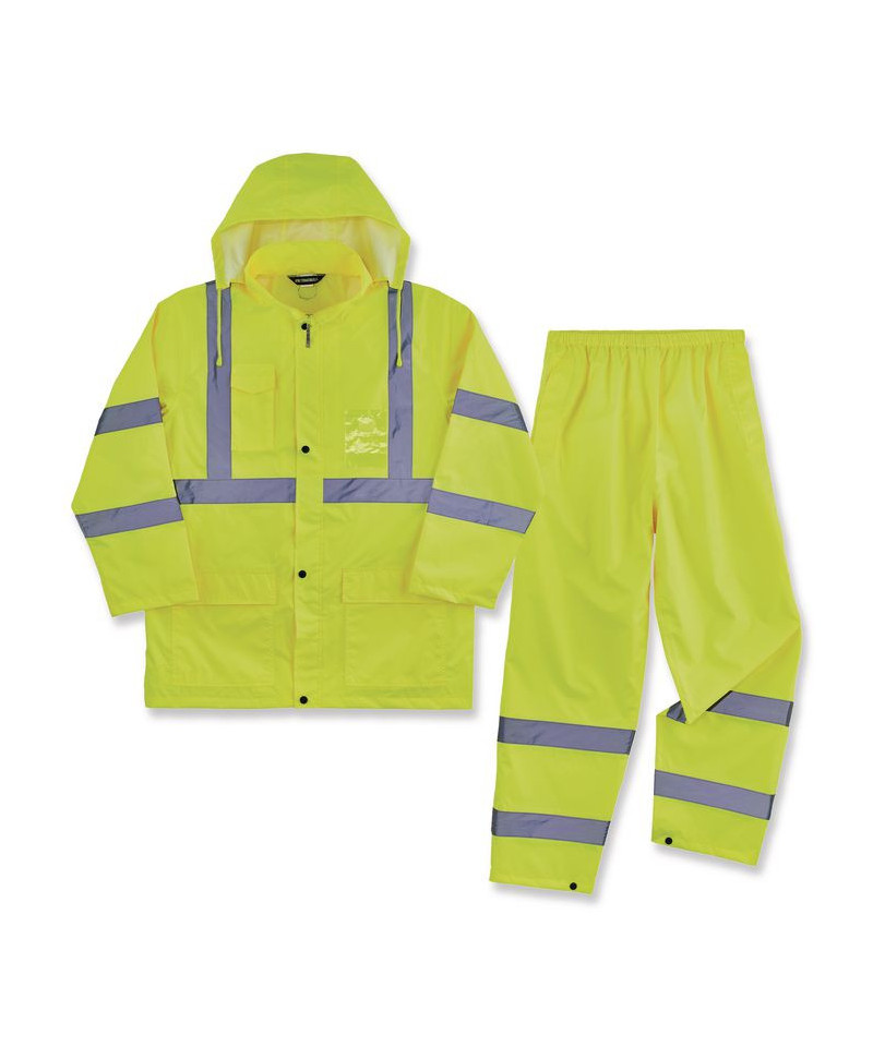 The GloWear 8376K Lightweight Hi-Vis Rain Suit Kit includes the 8366 Rain Jacket and 8916 Rain Pants for protection in wet conditions while maintaining high visibility compliance. The fully waterproof jacket and pants are constructed of rugged 150D polyester oxford with a PU coating and fully taped seams to keep workers dry. Compliant to ANSI/ISEA 107 Type R, Class 3 with reflective tape for enhanced low-light visibility. This lightweight reflective rain suit easily fits over workwear without sacrificing mobility, with an elastic waistband for comfort and snap cuffs on the pants for easy on/off over boots. Fully taped seams are bonded to keep water from sneaking in, while a vented cape-back on the jacket allows heat and moisture to escape for added breathability. An attached drawstring hood can be stowed away when not needed. The ANSI/ISEA 107-compliant high visibility polyester fabric and 2" reflective tape keeps workers highly visible at night or in low light conditions.