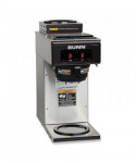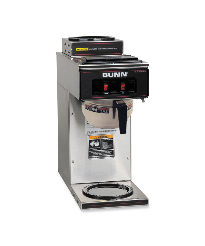 A simple switch design that requires neither plumbing nor special wiring. All stainless steel construction. Two individually controlled warmers one upper and one lower to maintain beverage temperature. SplashGard® black plastic funnel deflects hot liquids away from the hand. Brews directly into included 12-cup glass decanters. Pourover brewer requires no plumbing, completely portable. Just pour cold water in top and coffee brews immediately. Brews up to 3.8 gallons per hour.