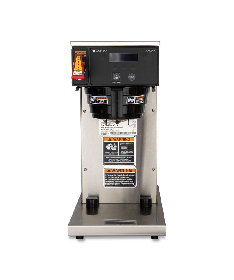 This Airpot Coffee brewer provides a medium volume brewing solution for the office or food service applications. Brews directly into your Airpot for a convenient dispensing experience. This brewer features Digital Brewer Control for precise extraction control resulting in high quality coffee experience. Brewer adjusts automatically to varying water pressure. Hot water faucet feature for soups and other hot drinks. Large tank provides back-to-back brewing capacity. For high lime areas, BrewLOGIC® technology calculates flow rate and adjusts brew time to maintain consistent pot levels. Ensure coffee quality with programming for brew level, cold brew lock- out and tank temperature, set easily from the front of the machine. SplashGard® funnel deflects hot liquids away from the hand.