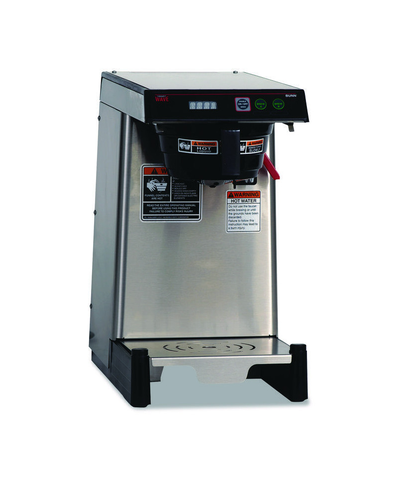 Four-digit LED read-out for simple programming. Utilize the same LED read-out for brewer status (Ready, Heating, Brewing). SmartWAVE technology increases turbulence in the brew funnel for uniformity of extraction. BrewMETER® allows automatic programming of pulse routine. SplashGard® funnel deflects hot liquids away from the hand. Brew directly into thermal carafes or low profile airpots. Thermal carafes and Airpots sold separately. Brews up to 3.9 gal per hour. Features a hot water faucet for soups and other hot drinks.