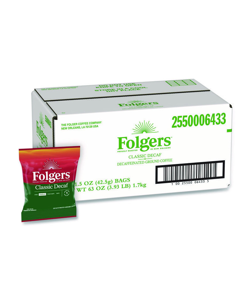 Folgers Classic Roast Decaf is a medium roast coffee carefully crafted with the world's richest and most aromatic beans delivering rich flavor without the caffeine. Convenient fraction packs are premeasured and ready for your commercial coffee brewer. The rich flavor of Folgers is more than just coffee – it's tradition. Folgers satisfies guests with the taste they love in a variety of convenient formats.