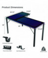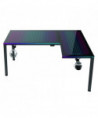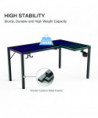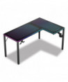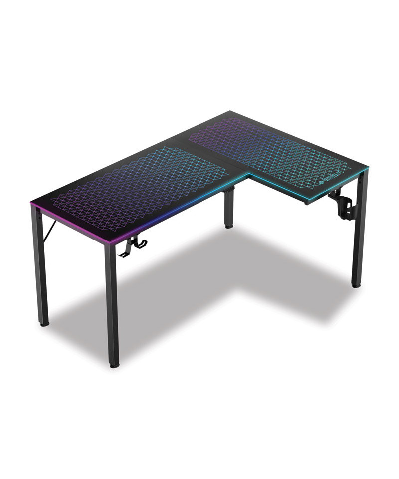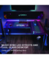 Glass gaming desk, features music sensing RGB LED lights. Dual headset hook, rotatable cupholder, power strip holder, and adhesive cable ties for optimal organization.
