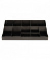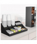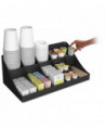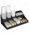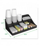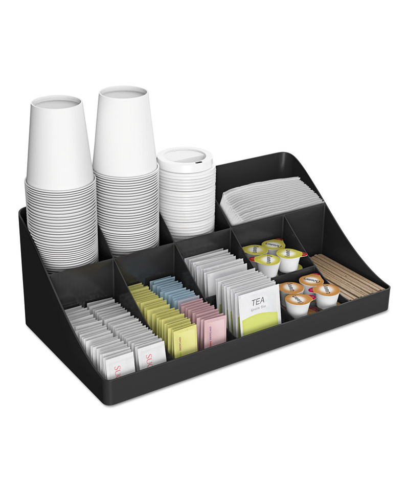 Add to the clean, modern design of your breakroom with a convenient coffee condiment organizer. The organizer's 11 compartments provide plenty of space for all of your serving essentials, including sugar, cups, stirrers, napkins, creamers and single-serve coffee pods. One-piece condiment organizer is made from a tough and safe plastic that will stand the test of time. This unit is easy to clean, so it stays attractive for a long time to come. Holds up to 300 cups. Perfect for offices with 100 employees or fewer.
