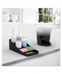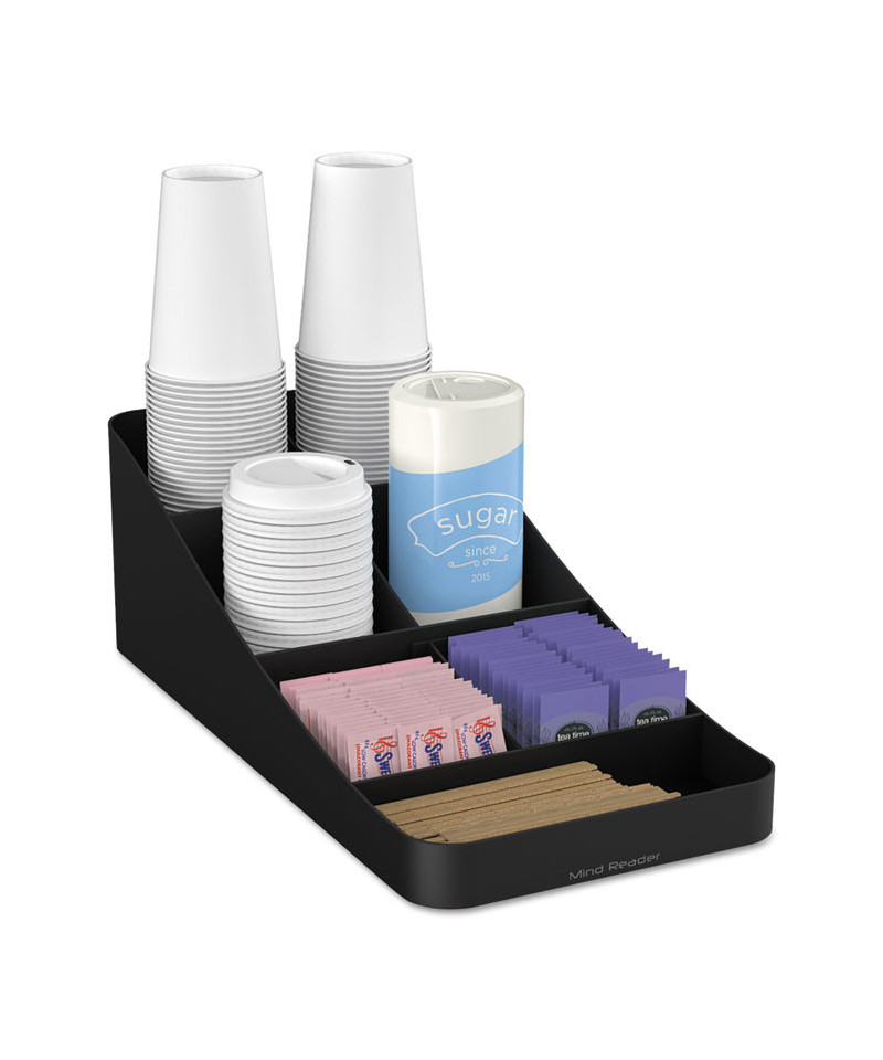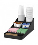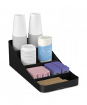 Handy, seven-compartment organizer holds all of your coffee and tea condiments, including cups. Holds sugars, creamers, stirrers, napkins, tea bags, cups, lids and more. One-piece coffee condiment organizer is made from a tough and safe plastic that will stand the test of time. Compact design conserves space on desks, countertops, tables and other surfaces. Open view organizer allows you to choose your favorite flavors and condiments. Bottom rubber grippers keep unit in place.