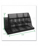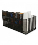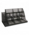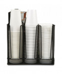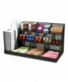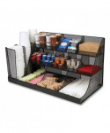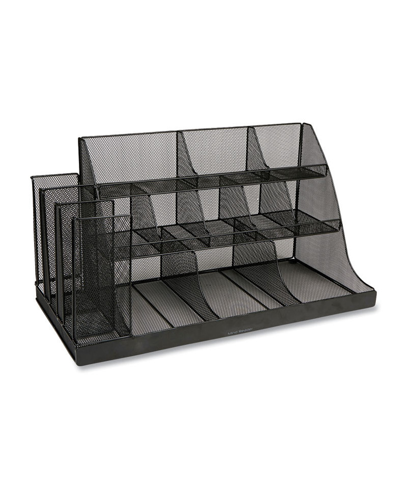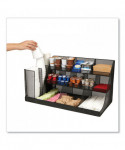 Upgrade your coffee breaks with this spacious 3-tiered, 14-compartment cup, condiment, and snack organizer, designed to put an end to rifled-through and unusable items. This coffee cup and snack station neatly displays items for easy access, catering to a wide variety of preferences. It's the perfect caddy for hotel lobbies, breakrooms, hospitality suites, restaurants, and office reception areas. In addition to storing and displaying coffee cups, condiments, and snacks, this versatile organizer can be used creatively on countertops or inside cabinets for other purposes. The various compartment sizes make it ideal for organizing office supplies like tape, pens, rubber bands, and tacks, as well as art supplies such as charcoal pencils, paintbrushes, glue sticks, scissors, and more. Maintaining this organizer is a breeze. Simply wipe the surface with a damp cloth for easy cleanup or rinse it under warm water for stubborn messes. Made from durable, metal mesh, the organizer is ready to use straight out of the box. The rubber grips on the bottom surface ensure the caddy stays securely in place on countertops and cabinets. Lightweight and durable, this compact organizer is perfect for taking on the go. Easily transport it to your hotel or dorm room, ensuring the luxury and convenience of a well-organized coffee break wherever you are. The cup, condiment, and snack organizer makes a thoughtful gift for travelers, students, business owners, and parents looking to create an easy snack station for children.
