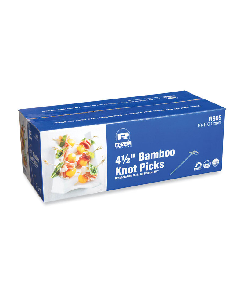 Add elegance to any catered event with a tastefully knotted bamboo pick. Attractive sculpted knot allows for an easy grip when patrons reach for an appetizer. Bamboo is a sturdy alternative to plastic and wood options. Knotted bamboo picks are ideal for sophisticated hors d'oeuvre or cocktail service and for dressing up sandwich servings.
