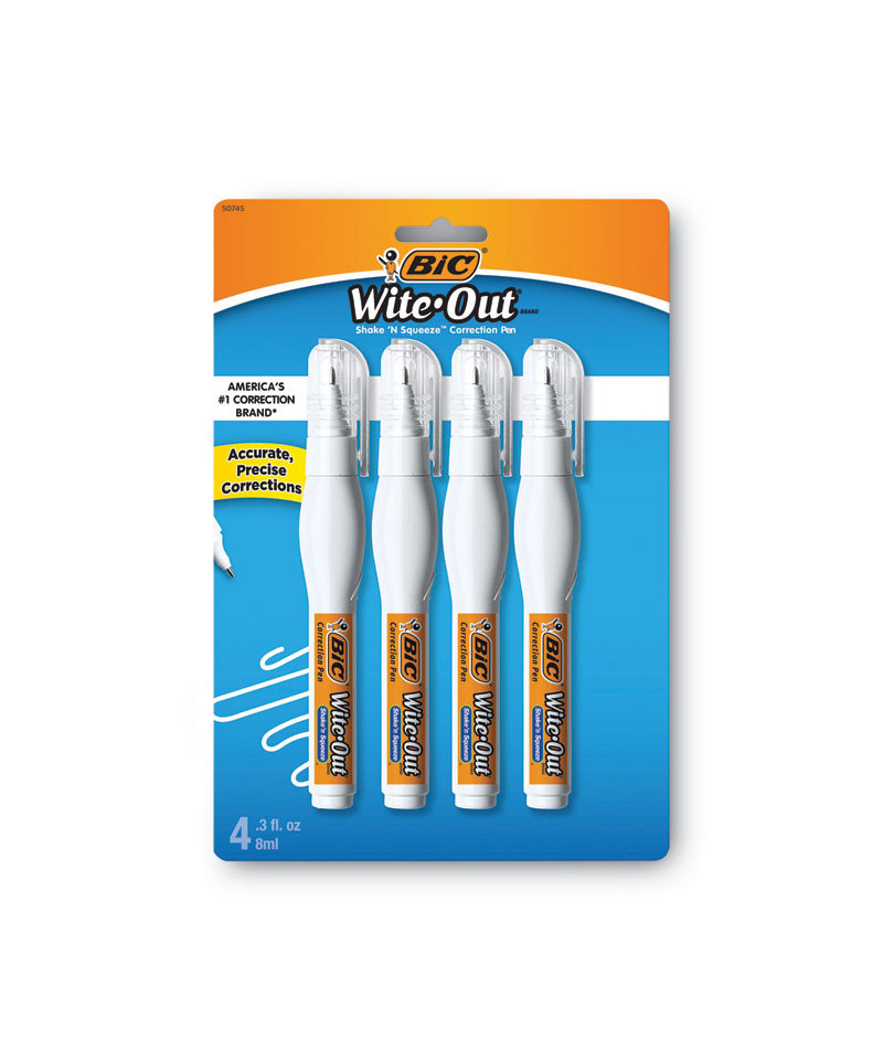 Make precise corrections on even the toughest errors with the BIC Wite-Out Brand Shake 'n Squeeze Correction Pen. Convenient pen features a needle-point tip for accuracy and a soft squeeze barrel for maximum fluid control. The white out liquid, correction fluid offers premium coverage on photocopies, faxes, ink, permanent marker, and more, and it dries quickly to a smooth finish. For best results, shake before using.