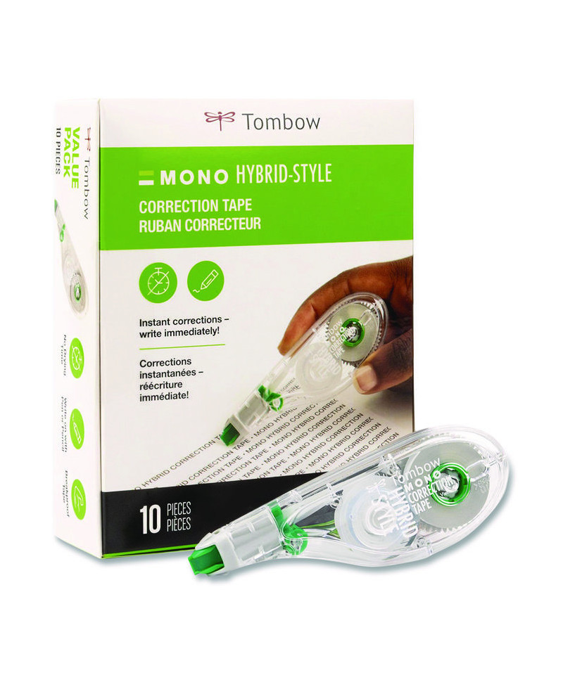 MONO® Hybrid® Correction Tape combines the convenience of a side-action applicator with the full view of a pen. This unique design allows you to comfortably make corrections throughout the work day. Single-line correction tape is perfect for correcting mistakes on typed or handwritten documents. The pivoting tape head delivers ultra-smooth tape application. Make instant corrections with no drying time no mess and no waiting! Dual Gear technology features a self-tightening mechanism which prevents tape looping and pulling. Retractable tip cover protects tape when not in use, making it safe to store in a pencil cup or desk drawer. Premium-quality tape allows you to re-write with pen, pencil or marker. Easily adjust break-proof tape with the rewind knob. Ergonomic applicator is comfortable for both right and left hand use. Non-refillable.