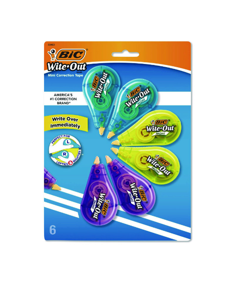 Fix mistakes fast with BIC Wite-Out Brand Mini Correction Tape! Suitable for lefties and righties, these brightly-colored correction tape dispensers are compact enough to fit in any bag. The correction tape goes on dry, allowing you to make instant corrections with no mess and no waiting time, while the convenient size allows hands of all sizes to make quick and accurate corrections.