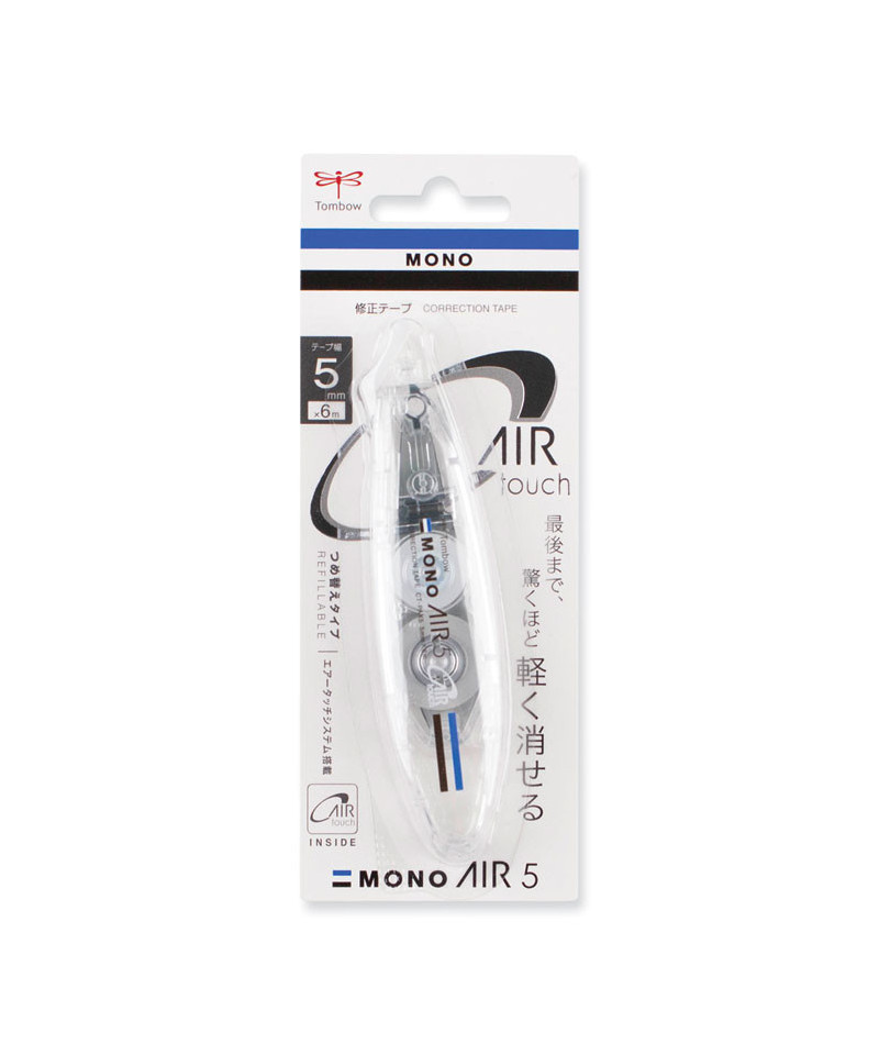 Experience effortlessly light application from start to finish with MONO Air Touch Refillable Correction Tape. Features Air Touch System that allows users to easily apply correction tape even with the lightest touch. Pivoting tape head and unique tape lock system that automatically stops tape and provides smooth, skip-free application. Convenient slender pen-style applicator with protective tip cover that prevents damage during storage. Write over dry correction tape immediately after application. Excellent tape adhesion to paper enables clean copying and easy rewriting. Easy to refill with snap-in cartridge.