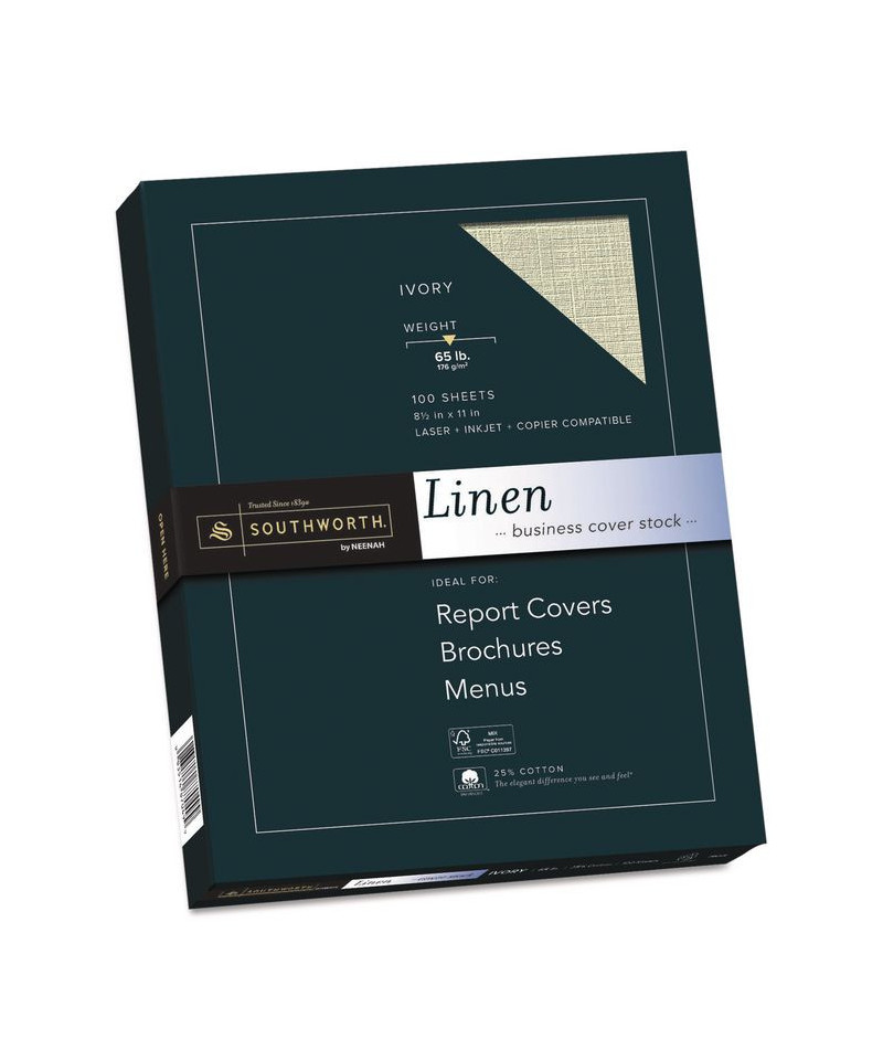 Southworth® 25% Cotton Linen Cover Stock captures the rich texture and feel of natural linen. This richly textured, cotton-fiber cover stock is ideal for report covers, brochures, menus, invitations and more-anywhere a distinctive look and feel is a must. Get personal with paper! Your choices say a lot about you and your business. The Southworth® collection of business papers is truly among the finest papers available for professional offices of any size. Communicate in style-from the first moment to enduring memory, cotton paper adds a touch of class, making first impressions more impressive with a distinct crispness and an unmistakable feel. Someone picking up your document will know, before they even read a single word, that there's something special to it. Cotton fiber also provides archival durability-it's the reason so many historic documents are still with us centuries later.