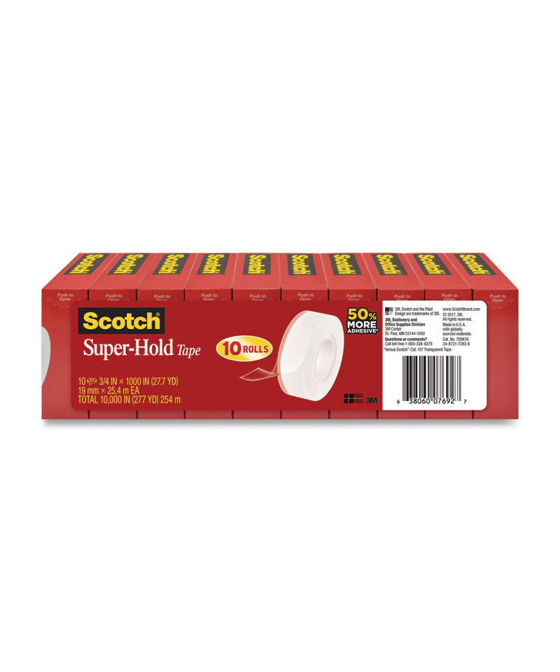 From sealing envelopes to making quick fixes on the fly, rely on the powerful bond of Scotch® Super Hold Tape. Designed with 50% more adhesive, this innovative tape offers a stronger bond than our standard transparent tape (Versus Scotch® Cat. 157 Transparent Tape). The thicker backing delivers outstanding durability when a secure, lasting hold is essential. Virtually crystal clear, this tape holds strong without standing outperfect for repairs, mounting, crafts and more. The convenient dispenser fits comfortably in your hand and lets you unroll and cut your desired amount with ease. Whether you're concealing confidential documents, sealing a small care package, trust what matters to you to the superior adhesion of Scotch® Super Hold Tape.