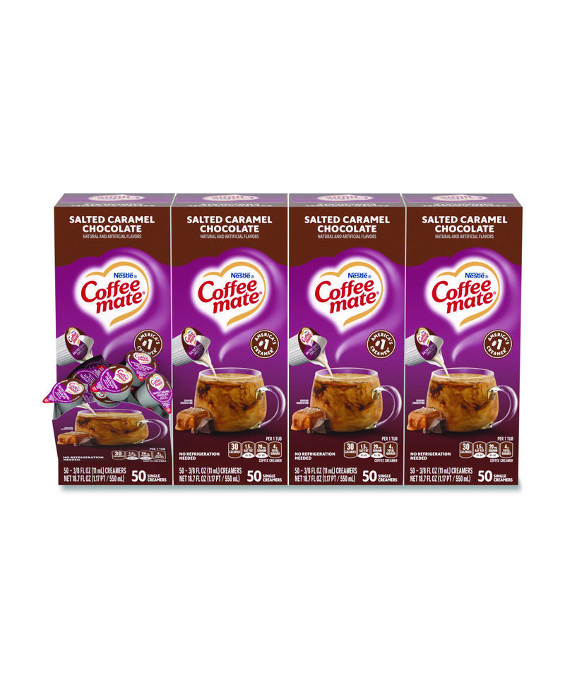 Liquid Coffee Creamer, Salted Caramel Chocolate, 0.38 oz Mini Cups, 50/Box, 4 Boxes/Carton
