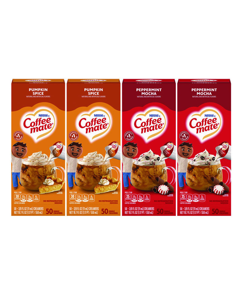 Liquid Coffee Creamer, Peppermint Mocha/Pumpkin Spice, 0.38 oz Mini Cups, 50/Pack, 4 Packs/Carton