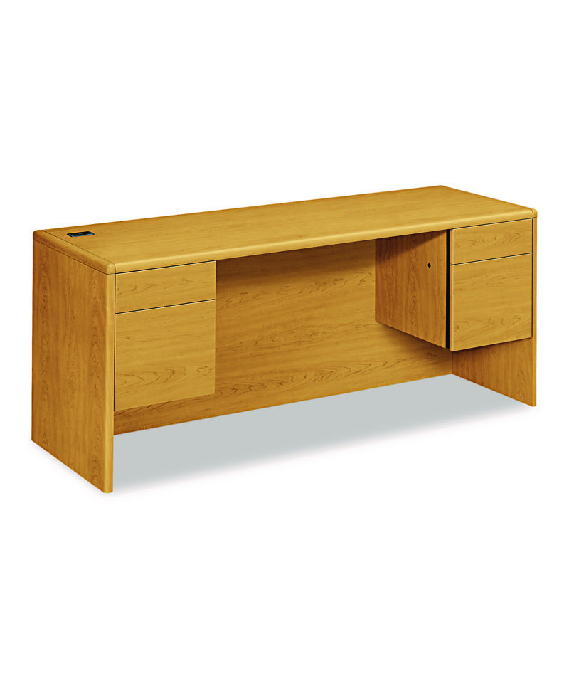 A modular management solution that combines stylish profiles and elegant accents with top-grade fit and finish. Laminate with rounded corners and waterfall edge. Full-extension file drawers and 3/4-extension box drawers ride on steel ball bearing suspensions. Hang rails accommodate letter and legal size hanging files. Two cord management grommets. HON® “One Key” core removable locks.