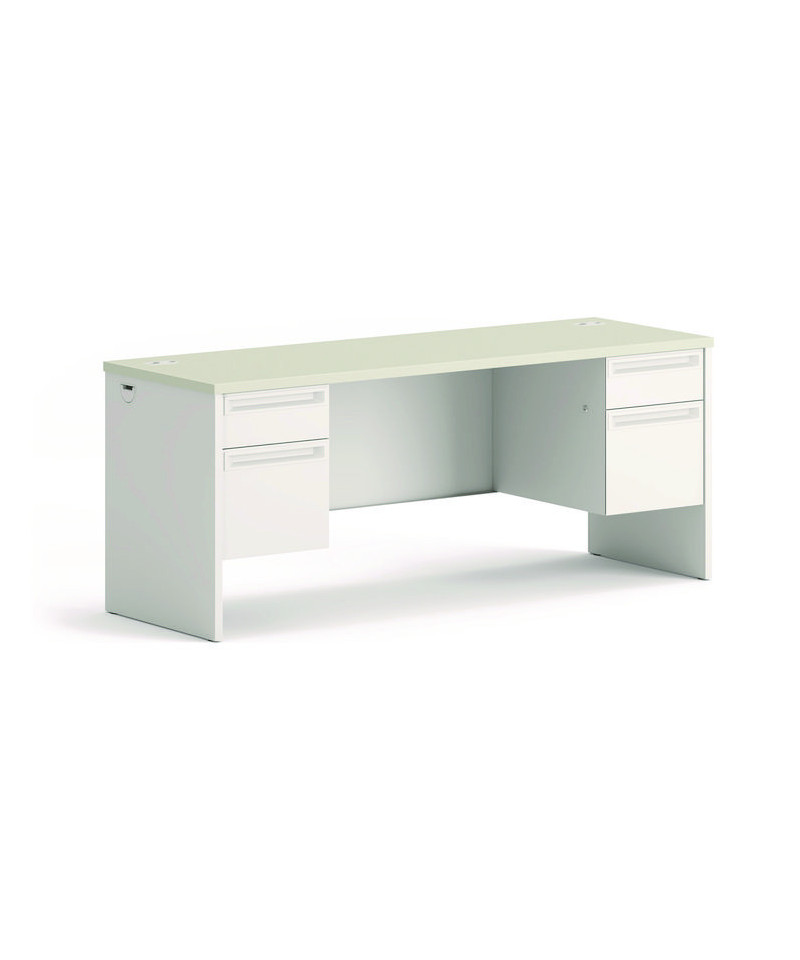Steel frame with steel-reinforced, high-pressure laminate top for superior rigidity and strength. Drawers operate on heavy-duty steel ball bearing suspensions. High-sided, full-extension file drawers accept hanging file folders; box drawers extend three-quarters. HON® "One Key" core removable locks. Convenient cord management grommets.