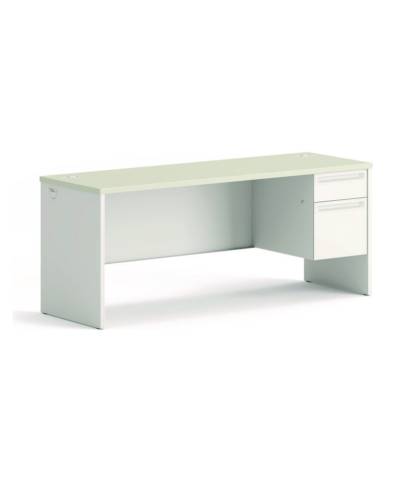 Steel frame with steel-reinforced, high-pressure laminate top for superior rigidity and strength. Drawers operate on heavy-duty steel ball bearing suspensions. High-sided, full-extension file drawer accepts hanging file folders; box drawer extends three-quarters. HON® "One Key" core removable locks. Cord management with ports and hidden channels.