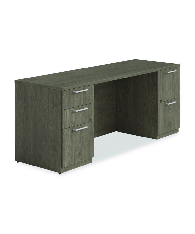 A versatile and durable addition to any office environment, combining modern design with high functionality. Built with two pedestals, this credenza provides efficient storage space for important files and office supplies, keeping your workspace organized and clutter-free. Its laser edge band design adds a clean, finished look that enhances the overall aesthetic of your office. Constructed from high-quality particleboard and featuring a thermofused melamine (TFM) finish, it is designed to withstand the rigors of daily use. The durable, high-performance laminate surface resists impacts, scratches, and burns, ensuring long-lasting durability while maintaining a polished appearance. Pair it with returns and bridges to configure an L-shaped or U-shaped workstation that suits your needs. Its adaptability makes it perfect for both individual offices and collaborative workspaces. For added convenience, equipped with adjustable glides, allowing it to be easily leveled on uneven surfaces, ensuring stability and comfort.